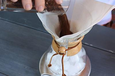 Using boiled water like you would with a normal Chemex, wet the grounds from the center out to the edge without reaching your filter, pausing to let the grounds bloom. When the dome of grounds has deflated, continue pouring in a spiral, using about 1/3 of your water at a time.